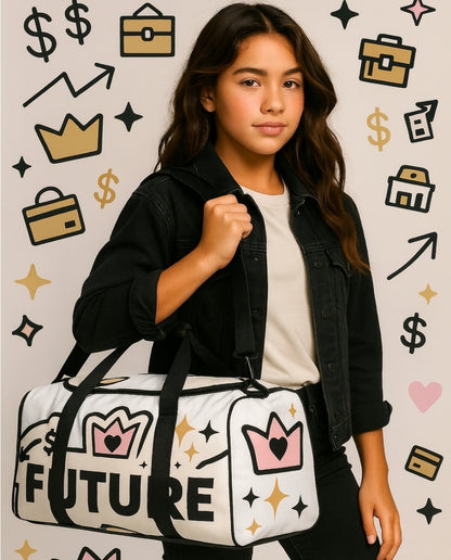 From school days to weekend takeovers, the Future Mogul™ Duffle Bag by Xzeckies™ keeps every move boss-level. Designed with a luxe cream base, soft pink crowns, and gold accents, it’s equal parts style and statement — perfect for the girl who’s going places and already knows she’s a vibe.